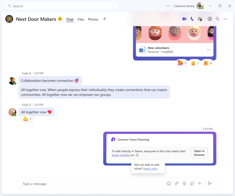 If you see the message above after adding a Loop component to a chat in Teams Free, please make sure all chat participants have their email visibility turned on. That enables collaboration in the Loop component directly in the chat.