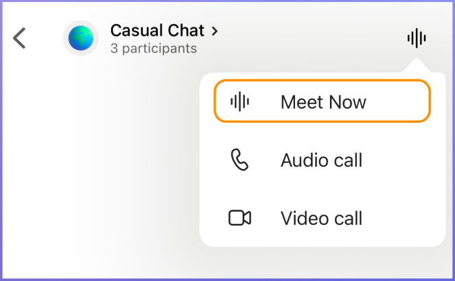 Starting a quick meeting in a group chat on mobile is now just as seamless as it is on desktop. Simply tap the call icon in any group chat, then select ‘Meet Now’ to launch an instant meeting—no scheduling required.